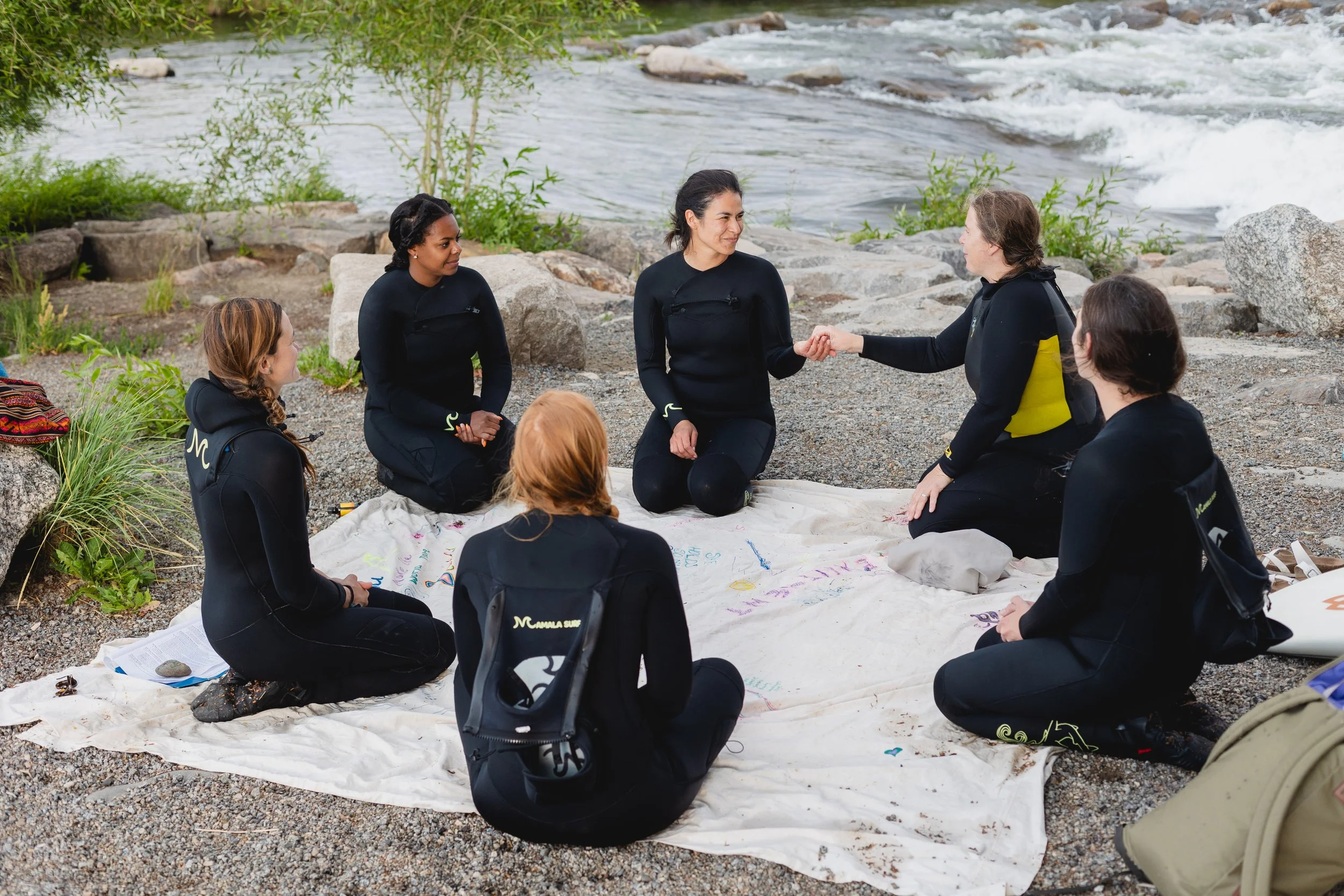 This is a small group therapeutic program for all self-identifying womxn wanting to dive deeper into the unique flow of river waves. These workshops use the Groundswell Community’s surf therapy curriculum to support women in developing a basic understanding of rivers, self-rescue, and balance while incorporating positive change psychology and expressive arts therapy. Along with learning how to surf, participants will engage in somatic feminine embodied learning through mindfulness, yoga, mental health awareness, and self-love tools. The surf sessions foster a sense of collective empathy and confidence through community healing, offering each participant solidarity, strength, and a renewed sense of self amidst the rhythm of the waves. **Workshops and clinics include all the necessary river surf equipment, except that participants will need to provide their own neoprene booties or river shoes.